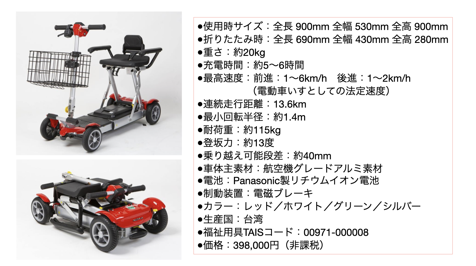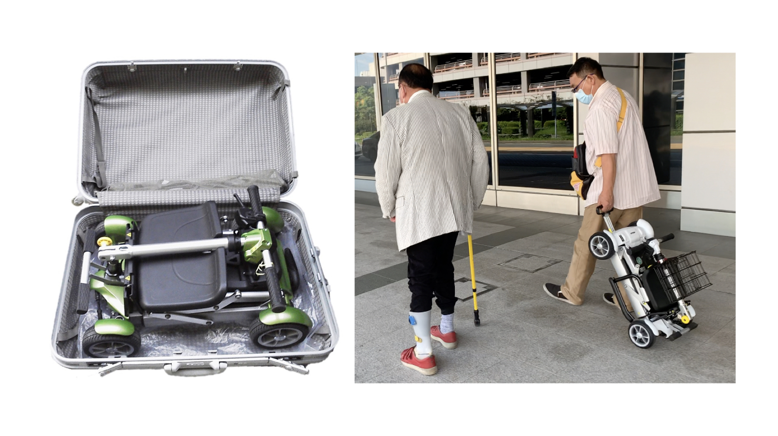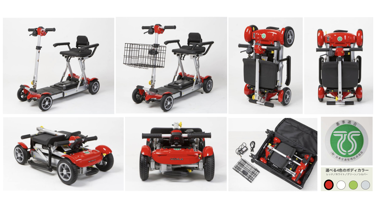 折り畳んで、スーツケースのように引いて持ち運びができる。軽自動車やタクシーのトランクにも収納できる。348,000円(非課税)。レンタルも。